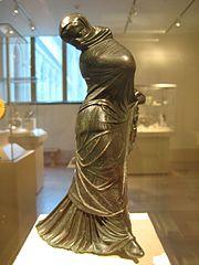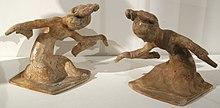 References to dance can be found in very early recorded history; Greek dance (horos) is referred to by Plato, Aristotle, Plutarch and Lucian.[8] The Bible and Talmud refer to many events related to dance, and contain over 30 different dance terms.[9] In Chinese pottery as early as the Neolithic period, groups of people are depicted dancing in a line holding hands,[10] and the earliest Chinese word for "dance" is found written in the oracle bones.[11] Dance is further described in the Lüshi Chunqiu.[12][13] Primitive dance in ancient China was associated with sorcery and shamanic rituals.[14]