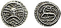 Silver coins from Ribe (c. 710-20). Odin and Christian cross symbols (left) and Norse pagan fantastic animal (right).