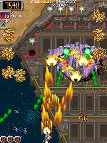 Power-ups are dropped by certain enemies throughout each stage that enhances the player's abilities. There are also bombs that clear the screen of enemies when fired and other items that increase the score.[2] Levels become more challenging as the player progresses, introducing new enemy types that react faster to the player's attacks and those that require more hits to destroy.[3] The game contains a hidden time attack mode where players try to score as many points possible within three minutes.[1]