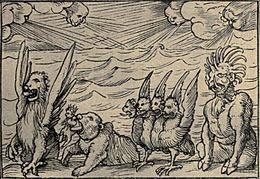 Many scholars have accepted the view that the imagery of Daniel 7 comes ultimately from the Canaanite myth of Baʿal's battle with Yamm (lit. "Sea"), symbolic of chaos. Although no exact prototype for the imagery exists, there are a number of parallels with the extant myth.[18] The four beasts are chaos monsters[18] which appeared as serpents in the Baʿal Cycle discovered in the ruins of Ugarit in the 1920s. In Daniel 7, composed sometime before Judas Maccabeus purified the temple in 164 BC, they symbolise Babylon, the Medes, Persia and Greece:[19]