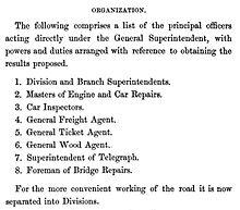In the government of five hundred miles in length a very different state exists. Any system which might be applicable to the business and extent of a short road would be found entirely inadequate to the wants of a long one. and I am fully convinced that in the want of system perfect in its details, properly adapted and vigilantly enforced, lies the true secret of their [the large roads’] failure; and that this disparity of cost per mile in operating long and short roads, is not produced by a difference in length, but is in proportion to the perfection of the system adopted..."[21]