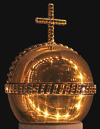 The Globus cruciger symbolizes Christian world supremacy. It is a golden globe decorated with a band of enamel and diamonds. On top of this is a half-circle of enamel and diamonds. It is topped by a diamond-studded cross. It was made in Hamburg for the coronation of Frederick III in 1648.