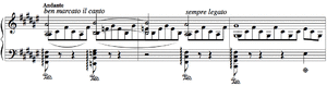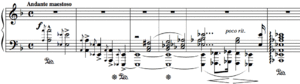 The piece is divided into two main subjects. The first, a chromatic theme in D minor, typifies the wailing of souls in Hell. D minor is a common key for music relating to death, as evidenced by Liszt's Totentanz[4] and the statue scene of Wolfgang Mozart's Don Giovanni. The first theme also heavily uses the tritone (augmented 4th or diminished 5th); this interval was known as the Devil's interval (or "Devil in music") and further reinforces the hellish imagery. The second theme is a beatific chorale in F-sharp major, derived from the first, which represents the joy of those in Heaven.[5] The key is also symbolic here, being the signature for other uplifting works of Liszt's, including Benediction of God in Solitude (part of Harmonies poétiques et religieuses)[6] and Les Jeux d'eaux à la Villa d'Este (Années de pèlerinage, Vol. 3, No. 4).[7] The secondary theme may also represent Beatrice, as it is interspersed within chromatic areas, similar to the character's appearances in hell. The piece ends with a rapid chromatic octave section that when played at speed seems to split into three distinct themes, reflecting the three heads of Satan in Dante's Inferno.