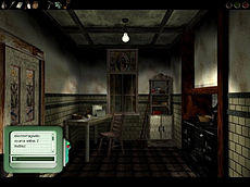 The game uses a basic point-and-click interface to move the player around and manipulate the game world, which is presented entirely through static pre-rendered images.[7] As the player moves the cursor around the screen it can change into different styles depending on the situation; neutral cursor (no interaction is possible), an arrow (the player can move in the direction indicated), a finger (indicating an item with which the player can directly interact), a wrench (the player must use an inventory item to initiate interaction), a magnifying glass (an area which can be examined in more detail), backwards arrow (the player can move backwards whilst facing the same direction; i.e. they do not have to turn around).[8]