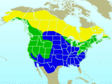 Approximate range in North America Breeding range Year-round range Wintering range | |