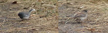 Their breeding habitat is coniferous or mixed forest areas throughout North America. In otherwise optimal conditions they also utilize other habitat, but at the southern margin of its range it can only persist in its favorite habitat.[14] Northern birds migrate further south, arriving in their winter quarters between mid-September and November and leaving to breed from mid-March onwards, with almost all of them gone by the end of April or so.[14][15] Many populations are permanent residents or altitudinal migrants, while in cold years they may choose to stay in their winter range and breed there.[14] For example, in the Sierra Nevada of eastern California, J. hymealis populations will migrate to winter ranges 5,000–7,000 feet (1,500–2,100 m) lower than their summer range. In winter, juncos are familiar in and around towns, and in many places are the most common birds at feeders.[2] The slate-colored dark-eyed junco is a rare vagrant to western Europe and may successfully winter in Great Britain, usually in domestic gardens.