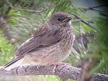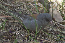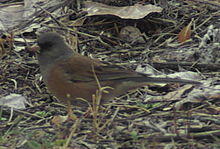 These subspecies have a blackish-gray head and breast with a brown back and wings and reddish flanks, tending toward duller and paler plumage in the inland and southern parts of its range.[11] Oregon dark-eyed juncos are less commonly known as brown-backed dark-eyed juncos. This is the most common subspecies group in the west, breeding in the Pacific Coast mountains from southeastern Alaska to extreme northern Baja California and wintering to the Great Plains and northern Sonora. An unresolved debate exists as to whether this large and distinct group is a full species.