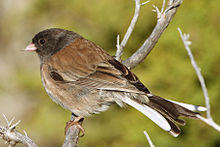 The dark-eyed junco (Junco hyemalis) is a species of junco, a group of small, grayish New World sparrows. This bird is common across much of temperate North America and in summer ranges far into the Arctic. It is a very variable species, much like the related fox sparrow (Passerella iliaca), and its systematics are still not completely untangled.