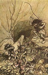 The descent of Wotan and Loge into Nibelheim is represented musically in the second entr'acte, which begins with the "Renunciation" and Spear motifs but is quickly overwhelmed with the insistent, rhythmic 9/8 beat of the Nibelung motif in B♭,[100] briefly foreshadowed in Loge's Scene 2 soliloquy.[101] In the climax to the entr'acte this rhythm is hammered out on eighteen anvils.[102] This motif is thereafter used, not just to represent the Nibelungs but also their enslavement in a state of relentless misery.[103] During the scene's opening interaction between Alberich and Mime, the soft, mysterious "Tarnhelm" motif is heard on muted horns; this is later combined with the "Serpent" motif as, at Loge's behest, Alberich uses the Tarnhelm to transform himself into a giant snake.[104] The transition back to the mountaintop, following Alberich's entrapment, references a number of motifs, among them Alberich's woe, the Ring, Renunciation and the Nibelungs' enslavement.[100][105][106]