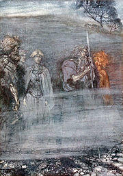 A few Rhinegold characters originate from outside the Eddas. Mime appears in the Thidriks saga, as a human smith rather than as an enslaved Nibelung.[14] The three Rhinemaidens do not appear in any of the sagas and are substantially Wagner's own invention; he also provided their individual names Woglinde, Wellgunde and Floßhilde.[15] In his analysis of The Ring Deryck Cooke suggests the Rhinemaidens' origin may be in the Nibelungenlied, where three water sprites tease the characters Hagen and Gunther. Wagner may also have been influenced by the Rhine-based German legend of Lorelei, who lures fishermen on to the rocks by her singing, and by the Greek Hesperides myth in which three maidens guard a golden treasure.[16]