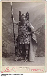 The American premiere of Das Rheingold was given by the New York Metropolitan Opera in January 1889, as a single opera, with Seidl conducting. The production used Carl Emil Doepler's original Bayreuth costume designs, and scenery was imported from Germany.[58] According to The New York Times, "[t]he scenery, costumes and effects were all designed and executed with great art and caused admirable results."[58] Of particular note was the performance of Joseph Beck who sang Alberich: "a fine example of Wagnerian declamatory singing, His delivery of the famous curse of the ring was notably excellent in its distinctness and dramatic force".[58] On 4 March 1889, with largely the January cast, Seidl conducted Das Rheingold to begin the first American Ring cycle.[59] Thereafter, Das Rheingold, either alone or as part of the Ring, became a regular feature of the international opera repertory, being seen in St Petersburg (1889), Paris (1901), Buenos Aires (1910), Melbourne (1913),[n 6], and Rio de Janeiro (1921), as well many other major venues.[7]