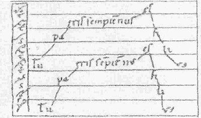 The notational signs were then placed at the far left of the staff (similar in placement to modern clef), and some illustrations are supplemented with "T" and "S" in between the signs so as to clarify the placement of semitones.[5] Syllables of the spoken words were then written on the staff lines (see example above). If the pitch changed, the word syllables would be raised or lowered to a different staff line. This was used to notate organum in two, three and four-voice styles.[2]