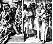 In the Talmud and the Zohar the reference to Zelophehad having "died in his own sin" is used to equate him with the man executed for gathering sticks on the Sabbath,[11][12] but Sifri Zuta says that it cannot be known if he was.[13] In the Talmud, Rabbi Joshua interpreted that they petitioned first the assembly, then the chieftains, then Eleazar, and finally Moses, but Abba Chanan said in the name of Rabbi Eliezer that Zelophehad's daughters stood before all of them as they were sitting together.[14] The Zohar said that Zelophehad's daughters drew near to Moses in the presence of Eleazar and all the chieftains because they were afraid of Moses' anger at Zelophehad and thought that it might be contained in a public forum.[12] According to the Zohar, Moses presented the case to God instead of deciding it himself out of modesty.[12]
