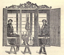 The Davenport brothers were exposed as frauds many times.[3] The stage magician John Nevil Maskelyne saw how the Davenports' spirit cabinet illusion worked, and stated to the audience in the theatre that he could recreate their act using no supernatural methods. With the help of a friend, cabinet maker George Alfred Cooke, he built a version of the cabinet. Together, they revealed the Davenport Brothers' trickery to the public at a show in Cheltenham in England in June 1865.[4]
