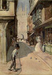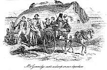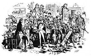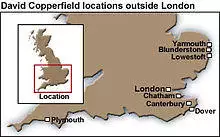 On 7 January 1849, Dickens visited Norwich and Yarmouth in Norfolk, with two close friends, John Leech (1817–1864) and Mark Lemon (1809–1870).[26] Leech was an illustrator at Punch, a satirical magazine, and the first illustrator for A Christmas Carol by Dickens in 1843. Lemon was a founding editor of Punch, and soon a contributor to Household Words, the weekly magazine Dickens was starting up; he co-authored Mr Nightingale's Diary, a farce, with Dickens in 1851.[27][28] The two towns, especially the second, became important in the novel, and Dickens informed Forster that Yarmouth seemed to him to be "the strangest place in the world" and that he would "certainly try my hand at it".[29] During a walk in the vicinity of Yarmouth, Dickens noticed a sign indicating the small locality of Blunderston, which became in his novel the village of "Blunderstone" where David is born and spends his childhood.[15]