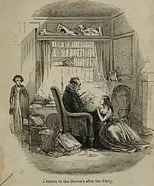 A serious incident occurred in December: Mrs Jane Seymour Hill, chiropractor to Mrs Dickens,[38] raised the threat of prosecution, because she recognised herself in the portrait of Miss Mowcher; Dickens did not do badly,[39] gradually modifying the psychology of the character by making her less of a caricature and, at the very end of the novel, by making her a friend of the protagonist, whereas at the beginning she served rather contrary purposes.[38] This was, writes Harry Stone, "the only major departure from his original plans."[40]