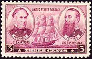 Few naval officers in American history have been honored on a U.S. postage stamp, but David Farragut has been so honored more than once. The first postage stamp (at left) to honor Farragut was the 1-dollar black issue of 1903. The Navy Issue of 1937 includes (among five in a series) a 3-cent purple stamp which depicts Admirals David Farragut (left) and David Porter, with a warship under sail displayed at center. The most recent postage issue honoring Farragut was released from Gettysburg, Pennsylvania on June 29, 1995.[35][36]
