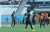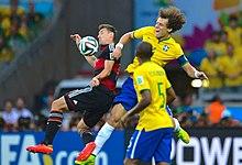 On 2 June, David Luiz was named in Brazil's squad for the 2014 FIFA World Cup.[83] He scored his first international goal in a 1–1 draw against Chile in the round of 16. He subsequently converted the team's first kick in the penalty shootout as they prevailed 3–2.[84] He scored the winning goal from a 35-yard free kick in a 2–1 win against Colombia in the quarter-final, and celebrated the goal by running towards the corner flag and kicking it.[85] In the absence of Thiago Silva due to suspension, David Luiz captained the Seleção in their 7–1 defeat to Germany at the semi-final stage of the tournament.[86] Brazil went on to lose the third-place play-off 3–0 against the Netherlands.[87]