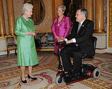 He was sworn in on September 5, 2007, at Queen's Park in Toronto. As the province's first Lieutenant Governor with a disability, Onley said he would use his vice-regal position to help remove physical barriers to Ontario's 1.5 million people with disabilities, as well as focus on other issues affecting the disabled, including obstacles to employment and housing. Onley also stated, in his installation speech, that he would expand on his immediate predecessor James Bartleman's First Nations literacy initiatives, his aim being to see computers on every student's desk in northern schools.[11] For his installation, Onley approached the legislature on his electric scooter, however he ascended the Throne on foot, using leg braces and canes. Onley also travelled to China to represent the Queen and Canada at the 2008 Summer Paralympics opening ceremony.[12] Onley delivered his last speech from the throne to the Ontario Legislative Assembly on July 3, 2014; his last full day in office was September 22, 2014 with his successor sworn in the following afternoon.