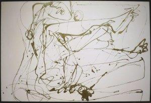 Smith continued to paint and draw throughout his life. By 1953, he was producing between 300 and 400 drawings a year. His subjects encompassed the figure and landscape, as well as gestural, almost calligraphic marks made with egg yolk, Chinese ink and brushes and, in the late 1950s, the "sprays".[2] He usually signed his drawings with the ancient Greek letters delta and sigma, meant to stand for his initials.[11] In the winter of 1963-64, he began a series known as the "Last Nudes". The paintings in this series are essentially drawings of nudes on canvas. He drew with enamel paint squeezed from syringes or bottles onto a canvas spread onto the floor.[12] Untitled (Green Linear Nude) is painted in a metallic olive green enamel, and exemplifies the artist's late action paintings.