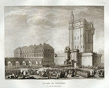 While the idea of the King's conspiracy to leave France grew, the Paris municipality voted to restore the dungeons of the Château de Vincennes to accommodate more prisoners. However a rumor developed claiming that there was an underground passage between the Tuileries and the Château. Suddenly people believed that the restoration was part of a conspiracy to disguise the passage and allow for the King to secretly leave France.[6] Thus on 28 February 1791 workmen from the faubourgs armed with pickaxes and pikes followed the lead of Antoine Joseph Santerre to Vincennes to demolish the prison. The goals of these workmen were to prevent the King from escaping through the Château and dismantle "the last remaining Institution of the Country".[7][8]