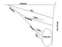 An illustration of Mahanadi Koyakhai distributray system in Odisha, India draining into Bay of Bengal and Chilka lake. Picture not drawn to scale