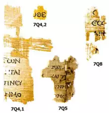 - ^ "Fragment of a scroll (Palestine: Qumran, Cave 4, 6.4 cm H, 4.2 cm W)". Archived from the original on 20 May 2013. Retrieved 14 June 2012.