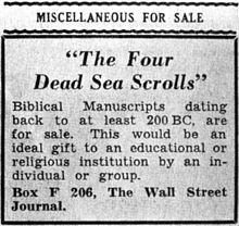 - ^ "The Dead Sea Scrolls – Discovery and Publication". Israel Antiquities Authority. Archived from the original on 14 June 2015. Retrieved 4 May 2015.