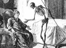 In Scandinavia, in Norse mythology death was personified in the shape of Hel, the goddess of death and ruler over the realm of the same name, where she received a portion of the dead.[8] In the times of the Black Plague, Death would often be depicted as an old woman known by the name of Pesta, meaning "plague hag". She wore a black hood. She would go into a town carrying either a rake or a broom. If she brought the rake, some people would survive the plague; if she brought the broom, however, everyone would die.[9]