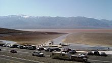 Death Valley National Park is an American national park that straddles the California–Nevada border, east of the Sierra Nevada. The park boundaries include Death Valley, the northern section of Panamint Valley, the southern section of Eureka Valley, and most of Saline Valley. The park occupies an interface zone between the arid Great Basin and Mojave deserts, protecting the northwest corner of the Mojave Desert and its diverse environment of salt-flats, sand dunes, badlands, valleys, canyons, and mountains. Death Valley is the largest national park in the contiguous United States, and the hottest, driest and lowest of all the national parks in the United States.[5] The second-lowest point in the Western Hemisphere is in Badwater Basin, which is 282 feet (86 m) below sea level. More than 93% of the park is a designated wilderness area.[6] The park is home to many species of plants and animals that have adapted to this harsh desert environment including creosote bush, Joshua tree, bighorn sheep, coyote, and the Death Valley pupfish, a survivor from much wetter times. UNESCO included Death Valley as the principal feature of its Mojave and Colorado Deserts Biosphere Reserve in 1984.[7]