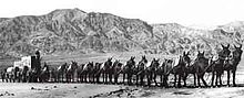 The California Gold Rush brought the first people of European descent known to visit the immediate area. In December 1849 two groups of California Gold Country-bound travelers with perhaps 100 wagons total stumbled into Death Valley after getting lost on what they thought was a shortcut off the Old Spanish Trail.[29] Called the Bennett-Arcane Party, they were unable to find a pass out of the valley for weeks; they were able to find fresh water at various springs in the area, but were forced to eat several of their oxen to survive. They used the wood of their wagons to cook the meat and make jerky. The place where they did this is today referred to as "Burned Wagons Camp" and is located near the sand dunes.