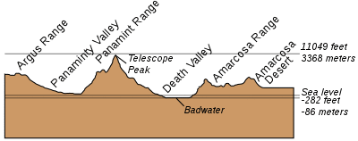 The highest range within the park is the Panamint Range with Telescope Peak being its highest point at 11,049 feet (3,368 m).[8] The Death Valley region is a transitional zone in the northernmost part of the Mojave Desert and consists of five mountain ranges removed from the Pacific Ocean. Three of these are significant barriers: the Sierra Nevada, the Argus Range, and the Panamint Range. Air masses tend to lose moisture as they are forced up over mountain ranges, in what climatologists call a rainshadow effect.