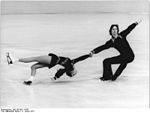 The death spiral is a figure skating term used to describe a spin involving two partners. One partner lowers the other partner while the partner getting close to the ice arches backward on one foot.[1] It was created by German professional skater Charlotte Oelschlägel and her husband Curt Newmann in the 1920s.[2] Suzanne Morrow and Wallace Diestelmeyer from Canada were the first pair team to perform the death spiral one-handed (the man holding the woman in position with one hand), at the 1948 Olympic Games.[3] In the 1960s, Soviet pair team Liudmila Belousova and Oleg Protopopov created three death spirals: "the backward-inside, forward-inside and forward-outside death spirals, which they originally named the Cosmic Spiral, Life Spiral and Love Spiral, respectively".[4]