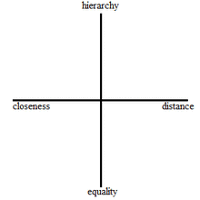 In this model, the vertical axis represents the level of power in the interaction, and the horizontal axis represents connection. Having presented this model, Tannen proposed that in the American paradigm, a sibling relationship would be mapped in the bottom left quadrant, as there is a high level of closeness and a relative equality that is not comparable to the power dynamic in an American parent/child relationship.[3] Using this new model, Tannen argues that connection maneuvers do not only occur independently of control maneuvers. Among other examples, she mentions a wife who refuses to let her husband take over making popcorn by saying "You always burn it".[3] According to Tannen, the wife's resistance to her husband's request is a control maneuver, but by citing a potential undesirable effect for her family (i.e. burnt popcorn), she ties a connection maneuver into her attempt to enforce a decision.
