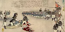 Decapitation (without seppuku) was also considered a very severe and degrading form of punishment. One of the most brutal decapitations was that of Sugitani Zenjubō (杉谷善住坊), who attempted to assassinate Oda Nobunaga, a prominent daimyō, in 1570. After being caught, Zenjubō was buried alive in the ground with only his head out, and the head was slowly sawn off with a bamboo saw by passers-by for several days (punishment by sawing; nokogiribiki (鋸挽き).[46] These unusual punishments were abolished in the early Meiji era. This scene is described in the last page of James Clavell's book Shōgun.