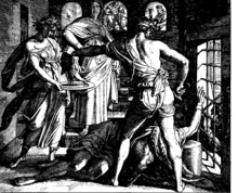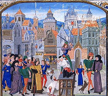 The word decapitation has its roots in the Late Latin word decapitare. The meaning of the word decapitare can be discerned from its morphemes de- (down, from) + capit- (head).[7] The past participle of decapitare is decapitatus[8] which was used to create decapitationem, the noun form of decapitatus in Medieval Latin. From the Medieval Latin form, decapitationem, the French word décapitation was produced.[8]