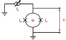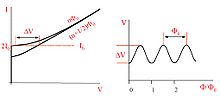 If the input current is more than , then the SQUID always operates in the resistive mode. The voltage, in this case, is thus a function of the applied magnetic field and the period equal to . Since the current-voltage characteristic of the DC SQUID is hysteretic, a shunt resistance, is connected across the junction to eliminate the hysteresis (in the case of copper oxide based high-temperature superconductors the junction's own intrinsic resistance is usually sufficient). The screening current is the applied flux divided by the self-inductance of the ring. Thus can be estimated as the function of (flux to voltage converter)[6][7] as follows: