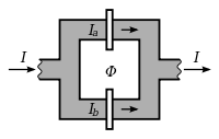 The DC SQUID was invented in 1964 by Robert Jaklevic, John J. Lambe, James Mercereau, and Arnold Silver of Ford Research Labs[3] after Brian David Josephson postulated the Josephson effect in 1962, and the first Josephson junction was made by John Rowell and Philip Anderson at Bell Labs in 1963.[4] It has two Josephson junctions in parallel in a superconducting loop. It is based on the DC Josephson effect. In the absence of any external magnetic field, the input current splits into the two branches equally. If a small external magnetic field is applied to the superconducting loop, a screening current, , begins to circulate the loop that generates the magnetic field canceling the applied external flux, and creates an additional Josephson phase which is proportional to this external magnetic flux.[5] The induced current is in the same direction as in one of the branches of the superconducting loop, and is opposite to in the other branch; the total current becomes in one branch and in the other. As soon as the current in either branch exceeds the critical current, , of the Josephson junction, a voltage appears across the junction.