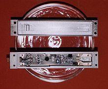 The RF SQUID was invented in 1965 by Robert Jaklevic, John J. Lambe, Arnold Silver, and James Edward Zimmerman at Ford.[7] It is based on the AC Josephson effect and uses only one Josephson junction. It is less sensitive compared to DC SQUID but is cheaper and easier to manufacture in smaller quantities. Most fundamental measurements in biomagnetism, even of extremely small signals, have been made using RF SQUIDS.[9][10] The RF SQUID is inductively coupled to a resonant tank circuit.[11] Depending on the external magnetic field, as the SQUID operates in the resistive mode, the effective inductance of the tank circuit changes, thus changing the resonant frequency of the tank circuit. These frequency measurements can be easily taken, and thus the losses which appear as the voltage across the load resistor in the circuit are a periodic function of the applied magnetic flux with a period of . For a precise mathematical description refer to the original paper by Erné et al.[6][12]