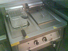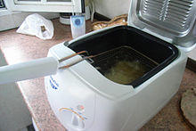 A deep fryer is a kitchen appliance used for deep frying. Deep frying is a method of cooking by submerging food into oil at high heat, typically between temperatures of 350 °F and 375 °F (175 °C to 190 °C).[1]
