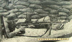 The regiment was assigned used equipment from the front-line troops of the 88th, and was well equipped considering the shoddy equipment that most Chinese forces had. Photos and records show that soldiers were each issued a rifle, likely a Hanyang 88 or Chiang Kai-shek rifle, 300 rounds of 8 mm Mauser, two crates of grenades, a German-made M1935 helmet, a gas mask, and food pouch.[3] There was a total of 27 light machine guns, mostly Czech ZB vz.26, approximately one for each squad. The four water-cooled Type 24 Maxim guns were the only heavy weapons available to the battalion—a mortar platoon assigned to them was never mentioned by participants of the battle, and was therefore unlikely to have joined the battle.[2]