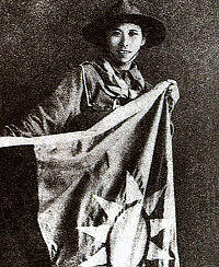 The same night, the Chamber of Commerce decided to send the soldiers a flag of the Republic of China.[5][7] Regiment-sized Chinese units did not carry army or national flags during the war, so when Yang Huimin delivered the flag to the warehouse, Xie had to personally accept the flag as the highest-ranking officer present. Yang Huimin asked for the soldiers' plans, to which the answer "Defend to the death!" was given. Yang Huimin, moved, asked for a list of all the soldiers' names to announce to the entire country.[5]