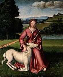 Medieval bestiaries stated that the only way to capture or tame a unicorn was by way of using a virgin as a lure, due to her implied purity.[20] The topic is popular in Renaissance paintings.