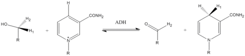 The result of a dehydrogenase catalyzed reaction is not always the acquisition of a positive charge. Sometimes the substrate loses a proton. This may leave free electrons on the substrate that move into a double bond. This happens frequently when an alcohol is the substrate; when the proton on the oxygen leaves, the free electrons on the oxygen will be used to create a double bond, as seen in the oxidation of ethanol to acetaldehyde carried out by alcohol dehydrogenase in the image on the right.[5]