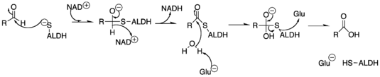 Considering how prevalent aldehydes are, there must be an enzyme to facilitate their oxidation to a less volatile compound. Aldehyde dehydrogenases (ALDH) are NAD+ dependent enzymes that function to remove toxic aldehydes from the body, functioning mostly in the mitochondria of cells. These enzymes are largely responsible for the detoxification of acetylaldehyde, which is an intermediate in the metabolism of ethanol. It has been shown that a mutation in the ALDH2 gene (one of 19 aldehyde dehydrogenase genes) is what leads to the common occurrence in East Asian population of a flushed face after consuming alcohol, due to the build-up of acetaldehyde.[14] This build-up of acetaldehyde also causes headaches and vomiting (hangover symptoms) if not broken down quickly enough, another reason why those with acetaldehyde DH deficiencies have bad reactions to alcohol.[15] Importantly, a lack of this enzyme has been linked to an increase in the risk of myocardial infarction, while activation has shown the enzyme's ability to reduce damage caused by ischaemia.[13]