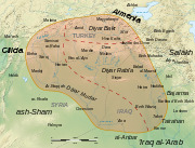 Ad-Deir is a common shorthand for Deir ez-Zor. In Syriac, Zeʿūrta (ܙܥܘܪܬܐ) means "little"; hence, Dīrā Zeʿūrta means "small habitation".[3] The current name, which has been extended to the surrounding region, indicates an ancient site for one of the Early Christian secluded monasteries spread since the persecution times and Apostolic Age throughout Mesopotamia.[4] Although Deir (ܕܝܪܐ), which is Arabic (borrowed from Syriac) for "monastery", is believed to have been kept throughout the various Medieval and modern age renamings, Zor, which indicates the riverbank bush, appeared only in some late Ottoman records of the Deir ez-Zor Vilayet.[5]