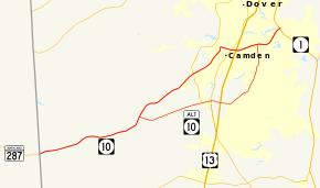 Delaware Route 10 (DE 10) is a state highway in Kent County, Delaware. It runs from Maryland Route 287 (MD 287) at the Maryland border in Sandtown east to an interchange with DE 1 at the North Gate of Dover Air Force Base in the southeastern part of the city of Dover. The route passes through the towns of Camden and Wyoming along the way. From the Maryland border to Camden, it is a two-lane undivided road that passes through rural areas. DE 10 is a four-lane divided highway called Lebanon Road between U.S. Route 13 (US 13) in Camden and DE 1. DE 10 has one alternate route, DE 10 Alternate (DE 10 Alt.), which provides an alternate alignment between Willow Grove and Highland Acres, passing through Woodside and Rising Sun.