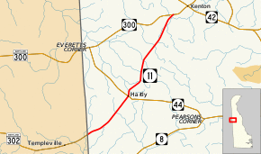 Delaware Route 11 (DE 11) is a state highway in Kent County, Delaware. It runs from Maryland Route 302 (MD 302) at the Maryland border near Templeville, Maryland northeast to DE 300 near Kenton. The road, known as Arthursville Road for its entire length, passes through the farmland of western Kent County and through the town of Hartly, where it intersects DE 44. The route was built as a state highway in the 1920s and 1930s and received the DE 11 designation by 1936.