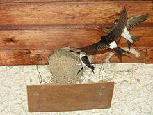 Breeding birds return to Europe between April and May, and nest building starts between late March in North Africa and mid-June in Lapland. The nest is a neat closed convex cup fixed below a suitable ledge, with a narrow opening at the top. It is constructed by both sexes with mud pellets collected in their beaks, and lined with grasses, hair or other soft materials. The mud, added in successive layers, is collected from ponds, streams or puddles.[9] House sparrows frequently attempt to take over the nest during construction, with the house martins rebuilding elsewhere if they are successful. The entrance at the top of the cup is so small once it is complete that sparrows cannot take over the nest.[20]