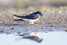 The preferred habitat of the common house martin is open country with low vegetation, such as pasture, meadows and farmland, and preferably near water, although it is also found in mountains up to at least 2,200 m (7,200 ft) altitude.[12] It is much more urban than the barn swallow, and will nest even in city centres if the air is clean enough.[12] It is more likely to be found near trees than other Eurasian swallows, since they provide insect food and also roosting sites. This species does not normally use the reed-bed roosts favoured by migrating barn swallows.[14][15]